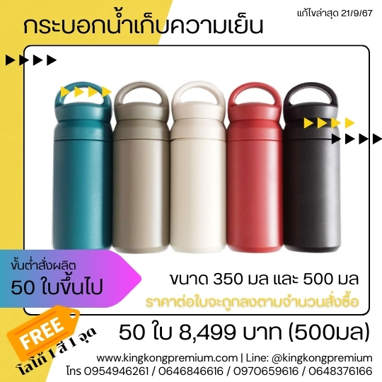 - กระบอกน้ำเก็บความเย็น เป็นของพรีเมี่ยมยอดฮิตและเหมาะมากสำหรับการเดินทาง เพราะสามารถเก็บเครื่องดื่มร้อน-เย็นได้นาน พกพาไปได้ทุกที่